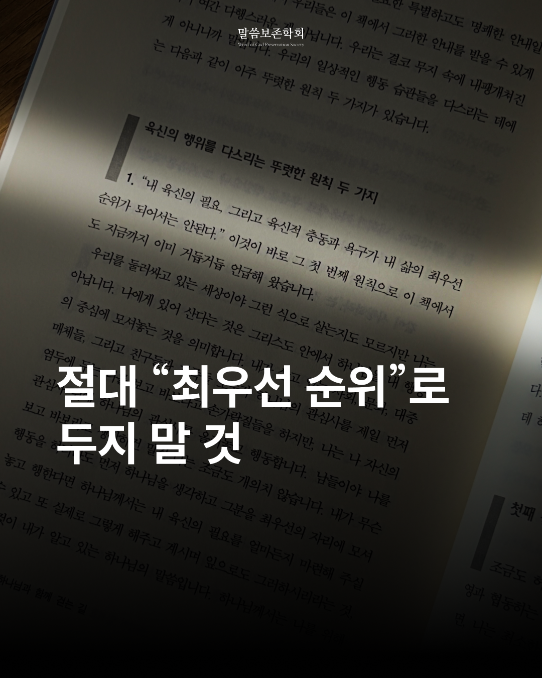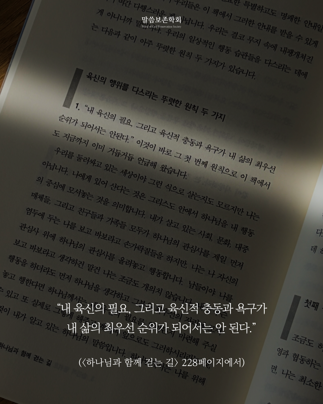 「내 육신의 필요, 그리고 육신적 충동과 욕구가 내 삶의 최우선 순위가 되어서는 안 된다.」(<하나님과 함께 걷는 길> p.228)